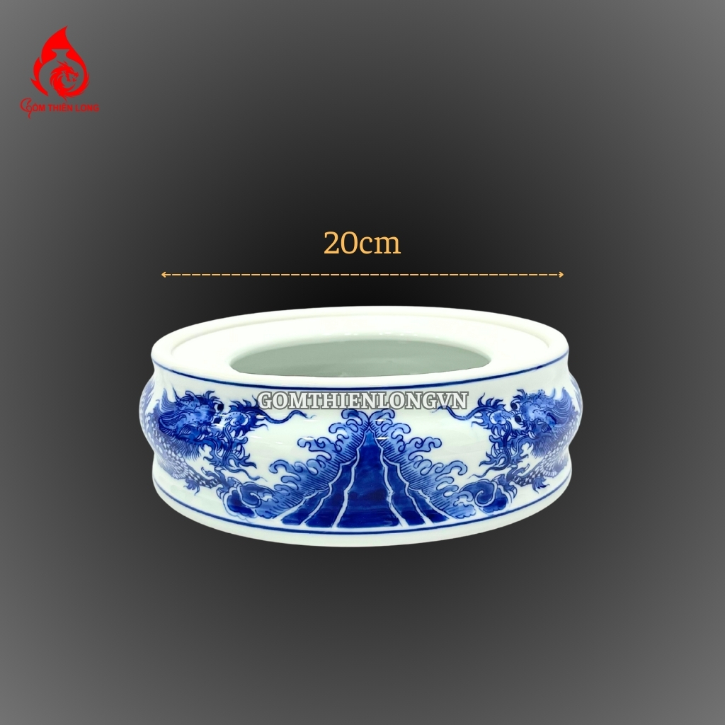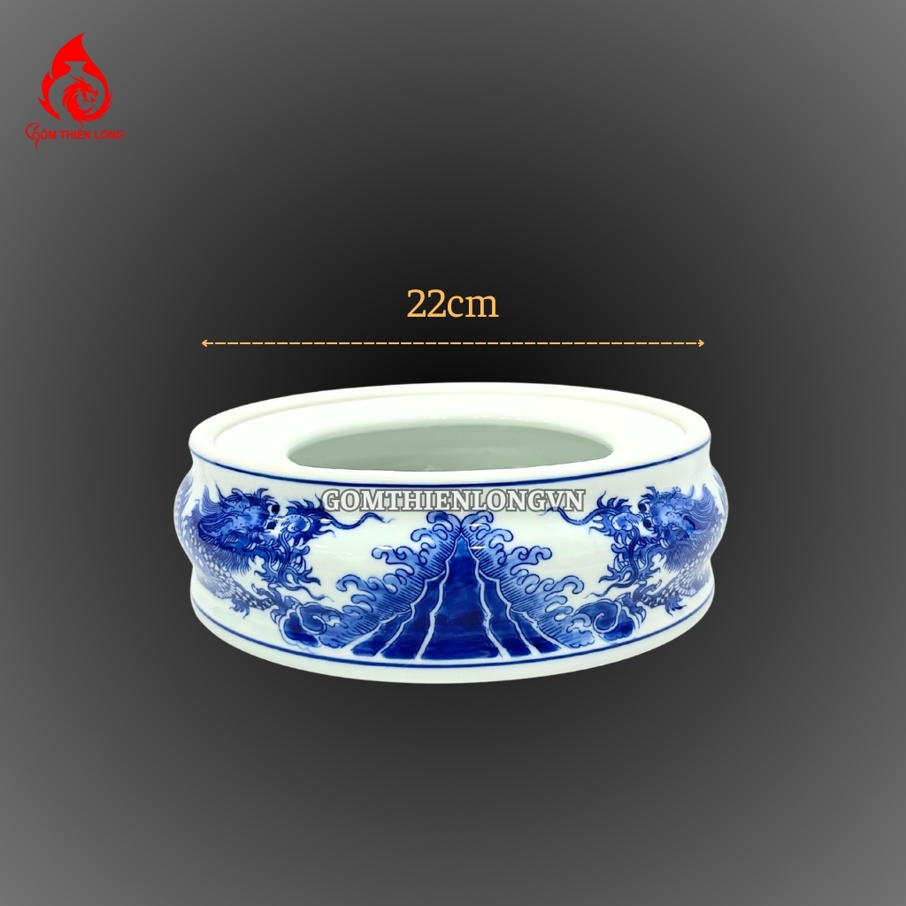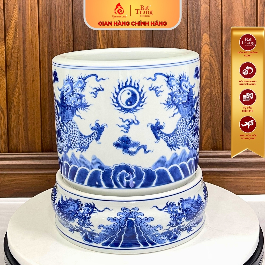Chân đế bát hương bằng sứ men lam vẽ rồng Bát Tràng là một sản phẩm được làm thủ công bởi những nghệ nhân gốm sứ Bát Tràng. Sản phẩm được làm từ chất liệu sứ cao cấp, được nung ở nhiệt độ cao nên có độ bền rất cao. Lớp men lam được phủ bên ngoài giúp sản phẩm có vẻ đẹp cổ kính mà sang trọng và tinh tế.